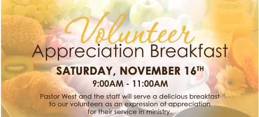 Pastor West and the staff will serve a delicious breakfast to our volunteers as an expression of appreciation for your service in ministry.